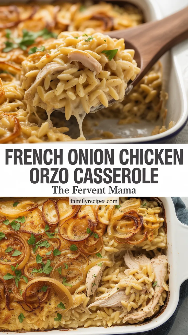 A creamy, savory one-pan casserole featuring tender chicken, caramelized onions, orzo pasta, and melted Gruyère cheese. This dish combines all the rich flavors of French onion soup in a hearty, comforting dinner perfect for busy weeknights.