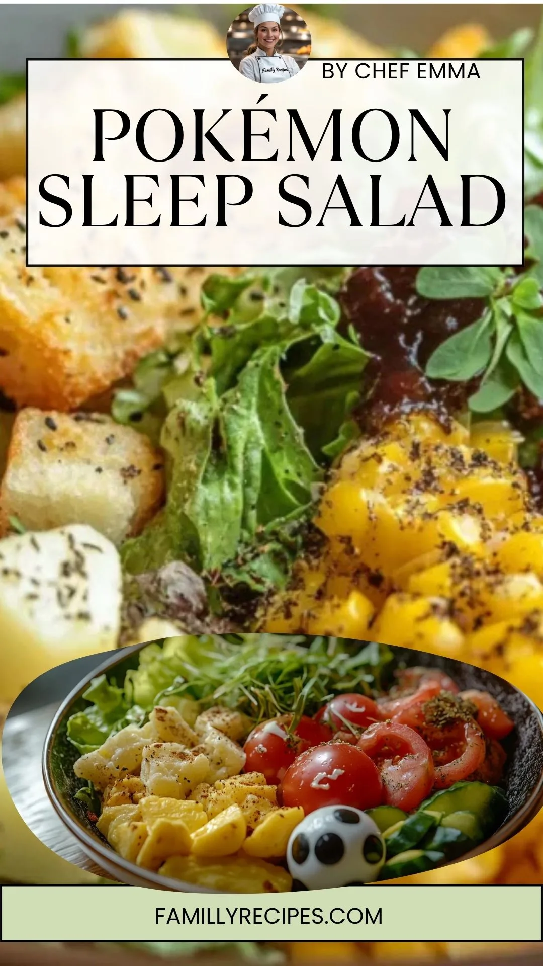 Pokémon Sleep Salad Recipes: A colorful Pokémon Sleep-inspired salad featuring cherry tomatoes, soft potatoes, sweet corn, fresh greens, croutons, and a drizzle of sauce in a ceramic bowl.